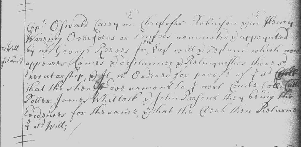 Since James Whitlock James appears in a 2 September 1689 court record in Middlesex County, some Whitlock researchers have concluded that when he left Gloucester County — apparently prior to April 1688 — he moved to Middlesex. Middlesex court minutes for 2 September 1689 show James called by the county court, along with Cuthbert Potter and John Parson, to verify the will of George Reeves after his Virginia overseers (i.e., executors) Captain Oswald Carey, Christopher Robinson, and Henry Waring had refused their charge as overseeers.[31] Reeves had made his will in England on 1 November 1675, stating that he was a merchant of “the island of Virginia” now residing in England. The will was probated 26 April 1689 in the prerogative court of Canterbury. When the will was probated in Virginia and the executors there refused their charge, the court called James Whitlock, Potter, and Parson to verify the will.[32]