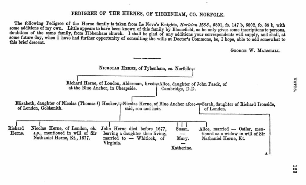 [41] Peter Whitlock, “Will of Alice (Paske) Herne, 1628,” Whitlock Family Newsletter 33,3 (September 2014), p. 10. The will of Sir Nathaniel Herne, who was a knight and alderman of London, was proved 28 August 1679: see Prerogative Court of Canterbury PROB 11/360/513. A digital image of the will is in the References section of the website of Whitlock Family One-Name Study, file R3546. An abstract of the will is in Lothrop Withington, Virginia Gleanings in England (Baltimore: Genealogical Publ. Co., 1980), pp. 202-3.