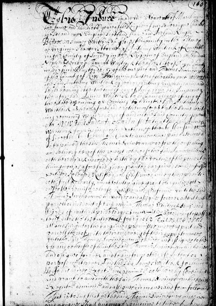 Thomas Whitlock Sr. had died seized of considerable landholdings in Virginia. His will notes that he lived in (Old) Rappahannock County on a tract of 600 acres that he was bequeathing to his son Thomas younger. It was evidently that piece of land that James Whitlock sold in March 1682 to Thomas Swinburne. The deed for the sale appears to state that Thomas Whitlock had patented the land James Whitlock was selling to Swinburne on 20 February 1662 — after Thomas Whitlock had died — but a 15 June 1722 deed of John Plaile of Sittenburne Parish in King George County and wife Catherine to Joseph Minton says that Swinburne had patented the land on that date.[7] I take this statement and the statement that the land had been patented to Thomas Whitlock on the same date in the James Whitlock-Thomas Swinburne deed to mean that Swinburne acquired Thomas Whitlock’s land after Thomas died, and the sale in 1682 was to formalize that arrangement.