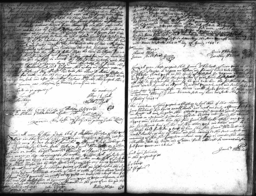 On 10 January 1684/5, with the deed stating that he was a planter of Ware Parish in Gloucester County, James Whitlock and his wife Dorothy assigned their interest in this land to Thomas Stacy of Christ Church Parish in Middlesex County.[19] The deed is signed by both James and Dorothy, indicating that both were literate. It was witnessed by Edmond More, Thomas Weste, and Simon Stubblefield Jr. James then signed an acknowledgment of a bond to Thomas Stacy for 1,000 pounds of tobacco. This document is important since it tells us that by January 1685, James had a wife Dorothy who would, it appears, be the mother of his son James Whitlock (before 1690 – 1736).