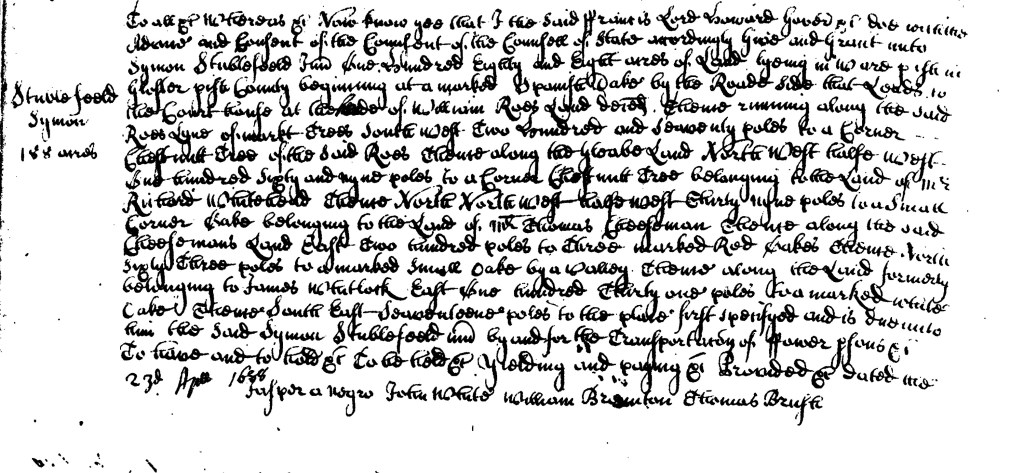 James Whitlock may have left Gloucester County by 23 April 1688 when a headright grant to Simon Stubblefield Jr. (Symon Stubblefeeld in the original) in Ware parish on that date states that the 188 acres Stubblefield was granted in Ware parish began by the road to the courthouse at the head of William Roe’s land, ran northwest along the glebe land to adjoin Richard Whitehead, then joined Thomas Cheesman on the east, and then ran along land formerly belonging to James Whitlock on the east and southeast.[25]