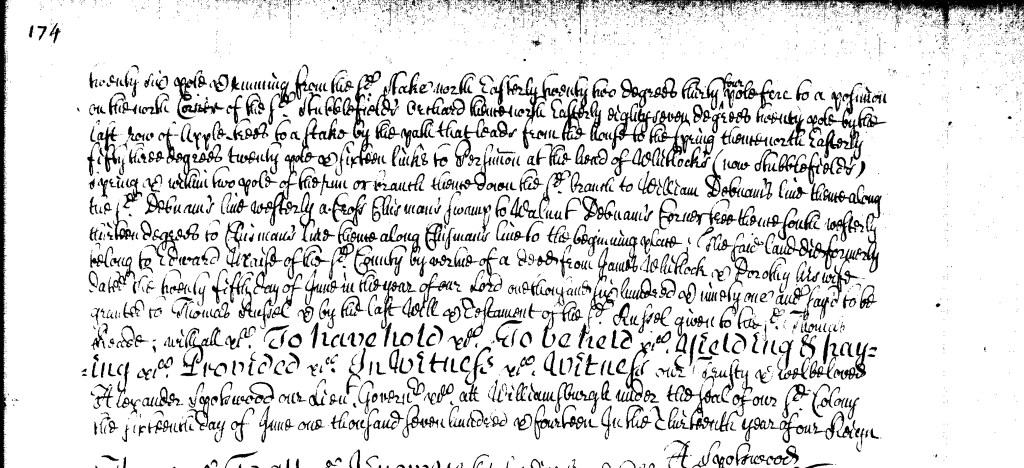 A 16 June 1714 Commonwealth patent to Thomas Reade of Gloucester County provides good clues about where James Whitlock and wife Dorothy lived in Gloucester County.[24] The patent notes that the 47 acres of escheat land Reade was patenting had formerly belonged to Edward Maise, and that James Whitlock and wife Dorothy had deeded the land to Maise on 5 June 1691. Maise then granted the land to Thomas Russell, who willed it to Thomas Reade. The patent states that the 47 acres began near Edward Stubblefield’s tobacco ground, from where his house’s chimney funnel bore northeast 26 poles to Whitlock’s (now Stubblefield’s) spring and adjoined William Debnam along Chisman’s line.