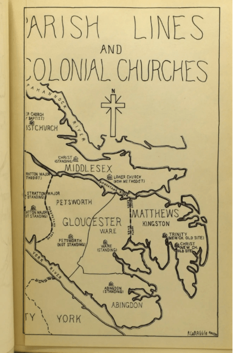[22] C.G. Chamberlayne, The Vestry Book of Petsworth Parish, Gloucester County, Virginia, 1677-1793 (Richmond: Library of Virginia, 1933), frontispiece. The map was drawn by Reverend A. LeB. Ribble.