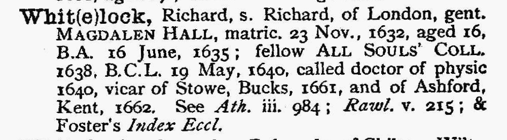 [2] Anthony à Wood, Athenæ Oxonienses, An Exact History of All the Writers and Bishops Who Have Their Education in the University of Oxford, vol. 3 (London: F.C. and J. Rivington, 1817), p. 984; and Joseph Foster, Alumni Oxonienses 1500-1714: The Members of the University of Oxford, 1500-1714, vol. 4(Oxford University: Oxford UP, 1891), p. 1620. The date of matriculation is in Foster. Wood states that Richard Whitlock entered Magdalen College during Michaelmas term an. 1632, aged 16.
