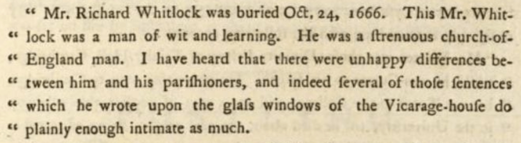 This Mr. Whitlock was a man of wit & learning: He was a Strenuous Church of England man. I have heard that there were unhappy differences between Him & His Parishioners; and indeed several of those Sentences which he wrote upon the Glass windows in the Parlour of the Vicarage-House do plainly enough intimate as much: There are other sentences that do not much look that way, but seem design’d as good Hints to the Reader to be Retain’d in mind on the common occasions of Life.