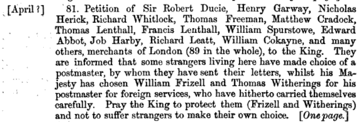 The Calendar of State Papers for 1633 contains a petition that appears to be dated in April (?) of that year, showing Richard Whitlock and many other London merchants petitioning the king to uphold William Frizell and Thomas Witherings as postmasters, at a time in which others living in London and identified as “strangers” had chosen an alternative postmaster.[13]