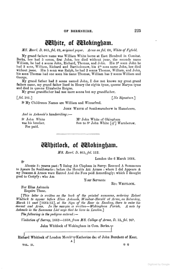 [17] As Rosemary Lea notes, “John Whitlock wrote in 1647 that his mother and brother [Robert] had a house in Oakingham [i.e., Wokingham] and lived there in the summertime….”(p. 25): see Rosemary Lea, “The Holt Estate and Its Owners — Part 1,” p. 25.