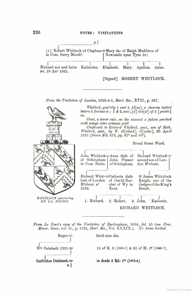 In 1664, Richard Whitlock’s son Robert requested and was granted a coat of arms for the Whitlock family of Wokingham. The lineage chart accompanying it names Robert’s parents Richard Whitlock and Katherine or Catherine, whose father is given as John at one point in this document and as David Burchet of Wye in Kent at another place in the document.