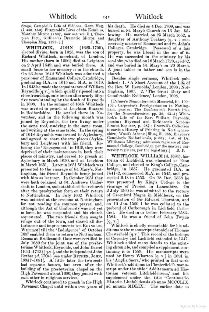 [20] This information is found in John Whitlock, A Brief Account of the Life of the Rev. William Reynolds, for Several years Minister of the Gospel in the Church of St. Mary, Nottingham; by the Rev. John Whitlock, at the Same Time Vicar of the Said Church, etc. (Nottingham: J. Dunn, 1807). Sections of John’s account are reproduced in Rev. Benjamin Carpenter, “A Historical Account of the Society of Protestant Dissenters Assembling in the High-Pavement Chapel, Nottingham,” The Christian Reformer, Or, Unitarian Magazine and Review 6,66 (June 1850), 346-356. See also John Whitlock’s biography in Dictionary of National Biography, vol. 61, ed. Sidney Lee (London: Smith, Elder, 1900), p. 141; Thomas Bailey, Annals of Nottinghamshire, vol. 2 (London: Simpkin, Marshall, 1852), pp. 802, 804; and George Lyon Turner, Original Records of Early Nonconformity Under Persecution and Indulgence: Historical and Expository, vol. 3 (London: Fisher Unwin, 1914), p. 284.