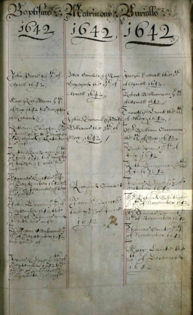 [16] St. Peter le Poer Church, London, Burial Register 1642, in the collection Church of England Parish Registers, 1538-1812 held by London Metropolitan Archives, and available digitally in Ancestry’s database London, England, Church of England Baptisms, Marriages and Burials, 1538-1812.