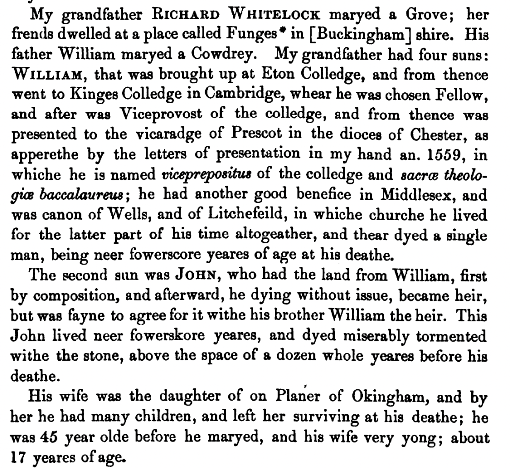 John Whitlock, father of Richard Whitlock (abt. 1583 – 1642) of Wokingham, Berkshire, England, and London, was born around 1509. We can estimate his birth year as around 1509 on the basis of information provided by his nephew Sir James Whitlocke (1570-1632) in James’s history of the Whitlock family entitled Liber Famelicus.[1] In his opening statement in this book, James Whitlocke states that he began writing Liber Famelicus 18 April 1609.[2] About his uncle John Whitlock, James writes that John was a son of James’s grandfather Richard Whitelock (d. 1556): he states,[3]
