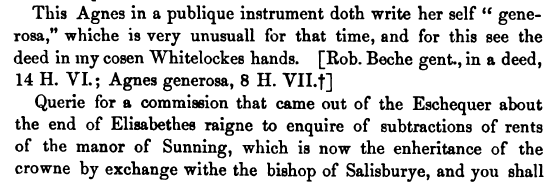 Then he explains that a deed held by his cousin William Whitlock of Beches shows Robert, bishop of Salisbury, giving to William de la Beche, ancestor of Agnes, the Beches estate and, in a deed dated 1247, awarding William de la Beche improvements of the rent the estate generated. The William Whitlock of Beches to whom James Whitlocke is referring here is, I think, William son of John Whitlock (1509-1589) and husband of Ursula Beresford, who inherited Beches, which then passed to William’s brother Richard (1583-1642).