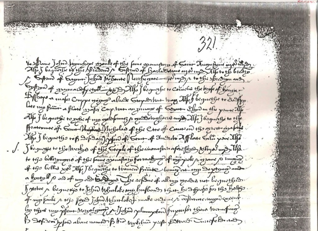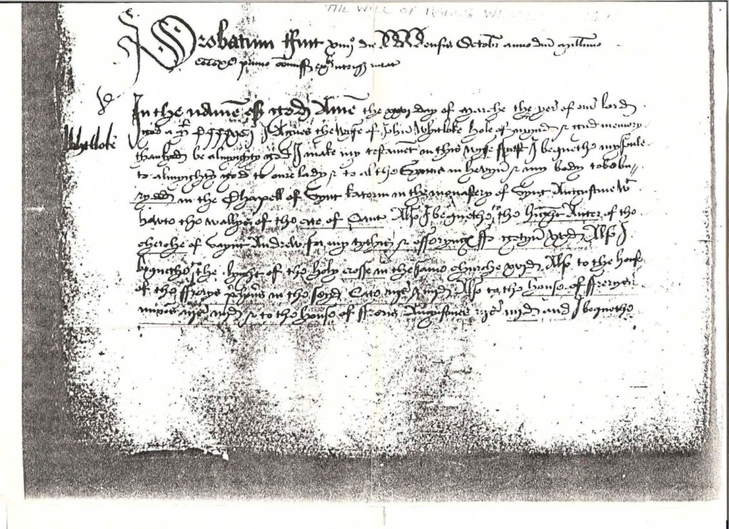 In the name of god Amn the xxvi Day of Marche the yere of our Lord god MCCCCVCj I Agnes the Wife of John Whitloke hole of mynd & gud memory thanked be almyghty god I make my testam’t on this wyse first I bequethe my soule to almyghty god to oure Lady & to al the Saynts in hevyn & my body to be buryed in the Chapell of Saynt Katern in the monastery of Saynt Augustine wt houte the wallys of the cite of Cant [Canterbury] Also I bequethe to the Gra [great] Auter [Altar] of the cherche of Saynt Andrew for my tything & offoryng Fo.gotyn xxd Also I bequethe to the house of the holy crosse in the same churche xvjd Also the the house of the Frerys p’hous in the sayd Cite iijs iiijd Also tothe house of Frerys minos iijs iiijd & to the house of Frers Augustine iijs iiijd and I bequethe to P….John Ivynchope Monke of the same monastory of Saint Augustyne iijs iiijd Also to th bredry & Sistrm of Barla.wne iijs iiijd Also to the Bredry & Sistrm of Saynt John wthoute Northegate iijs iiijd & to the brdryn & Systryn of Maynard Spetyll xxd Also I bequethe to Cornelia the Wife of Henty Sisshope a wafer Cuppe goyng abrode Stoped wit wax Also I bequethe to Godfrey late my Pri..t plate Mafer cup wit an ymage of Saynt…yn in the pruts Also I bequethe to yche of my godsonnez & goddolughters iiijd Also I bequethe to the Fratennce of Saint Nicholas of the ctte of Cant on the grett Masers Also I bequethe to B Desidari Upfon of Saint Andrew Applate Silu’peoe Also I bequethe to the workes of the Steple of the monasteri aforesaid xL iijs iiijd Also to the belleryngers of the same Monastery for makyng of my pele & grave & ringyng of the bells xs Also I bequethe to Women Brint..being at my Deptyng and a byryall & on of my old Go.wngs The residue of all my goodes not bequethed I ..leve & bequethe to John Whitloke my husband that he dispose for the hol.s of my soule & the sayd John Whitloke I make ordyne & Testitute mynd ex.ont by thys my p’sent Wrythyng & John Plumpton supviser thems Wetnesing B Desidari Upson above named B Fio Wykehin prest Pdward Turcefeld and James Z..ton &