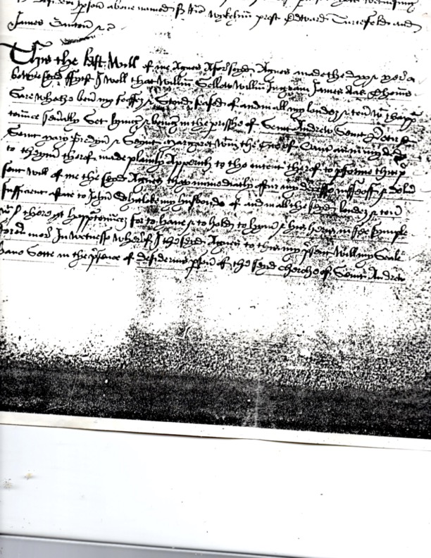 This the last Will of me Agnes Aforesayd Agnes made the day & yere above sayd First I Will that Will’m Sellors Will’m Ingram James .as Chorns Sure ……my feoffez & Stand seased of and in all my landez & ten’ wt the app’tence sev’ally Set lying & being in the prisshe of Saint Andrew Seint Peter Seint Mary Predyn & Seynt Margaret Wt in the Cite of Cant as in my dede to theym thereof made plainly Appernth to the intent thereof to pforme thro..d …. will of me the seyd Agnes thay …..Daily offur my D..ffo mffeoff & Del.. sufficient ….. to John Whitloke my husbande of and in all the seyd landez & ten’ wt & there wt happ’ternez for to have & to hold to hym & his heris in fee symple for e’ more In Witnesfs Whereof I the seyd Agnes to this my p’sent will my Seale have Sette in the p’sence of Desidernes pson of the seyd Cherche of Saint Andrew