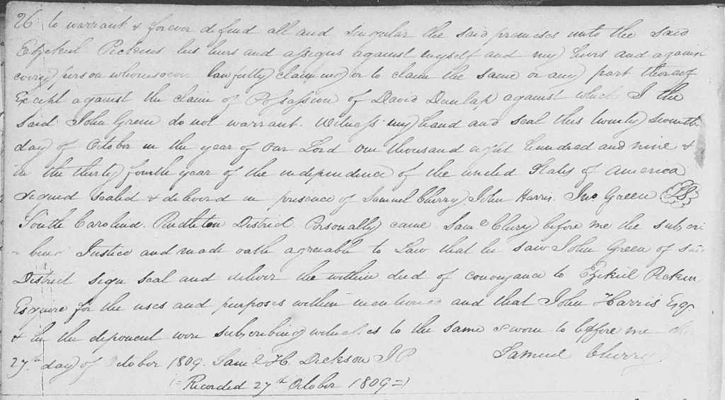 On 27 October 1809, John Green sold to Ezekiel Pickens, both of Pendleton, for $100 the 409 acres he had had surveyed on Little River, waters of the Keowee, on 30 September 1807.[17] The deed states that the grant for this land was made to John by the state on 5 October 1807. Samuel Cherry and John Harris witnessed the deed, and Cherry proved it on the day the deed was made and it was recorded on the same day. As has been previously noted, Ezekiel Pickens was a first cousin of John’s wife Jane Green, a son of Andrew Pickens and Rebecca Calhoun, a sister to Jane’s mother Mary Calhoun Kerr. I find no listing for this grant in the index to South Carolina grants.