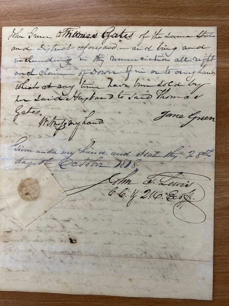 Jane Kerr Green’s original renunciation of dower document has survived and is now found in the “Lawrence Family Papers” at Clemson University’s Special Collections and Archives (box 1, mss 114). As noted above, John and Jane Green sold their land to Thomas Gates in 1818 as they moved to Alabama. On 14 December 1819, Gates sold some of the Green land to James and Elisha Lawrence, sons of the Greens’ neighbor Benjamin Lawrence, the land he had bought from John and Jane Green. The original plat for John Green’s 838 acres on the Keowee and Jane’s renunciation of dower passed from John and Jane to Thomas Gates as they sold their land to him, and from Gates to Lawrence, whose descendants saved these documents. In addition, Thomas Gates’ 14 December 1819 deed to James and Elisha Lawrence is preserved in the “Lawrence Family Papers” at Clemson’s archives. For a digital image of Gates’ deed to the Lawrence brothers, see this subsequent posting.