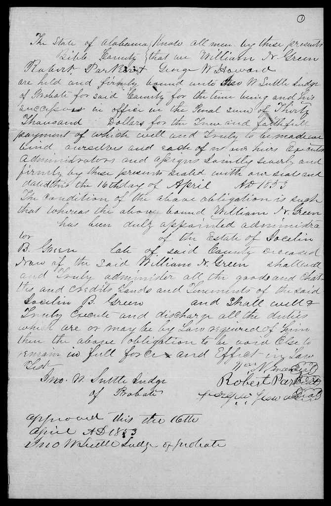 On 16 April 1853, William N. Green appealed for administration of the estate of Joscelin B. Green in Bibb County.[35] Probate minutes state that the widow Elizabeth relinquished her right to administer, and, since Joscelin had been dead over 15 days and had left no will, William N. gave bond for $30,000 with Robert Parker and Samuel Frazier for administration and was granted it. The original bond is in Joscelin’s loose-papers estate file held by Bibb County.[36]