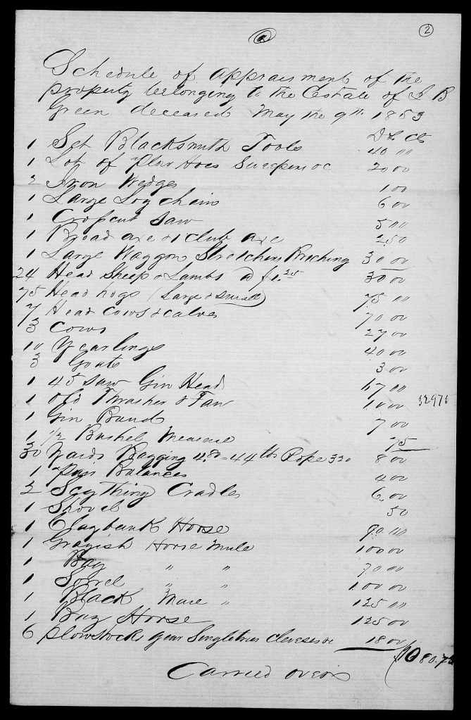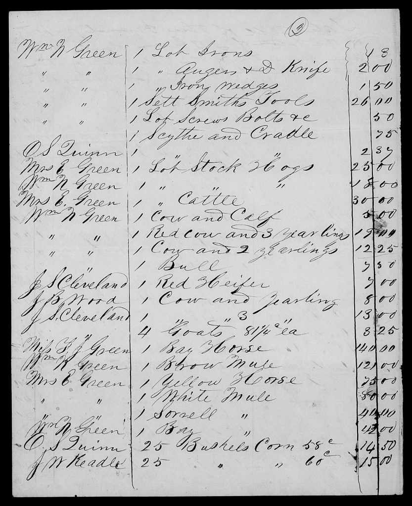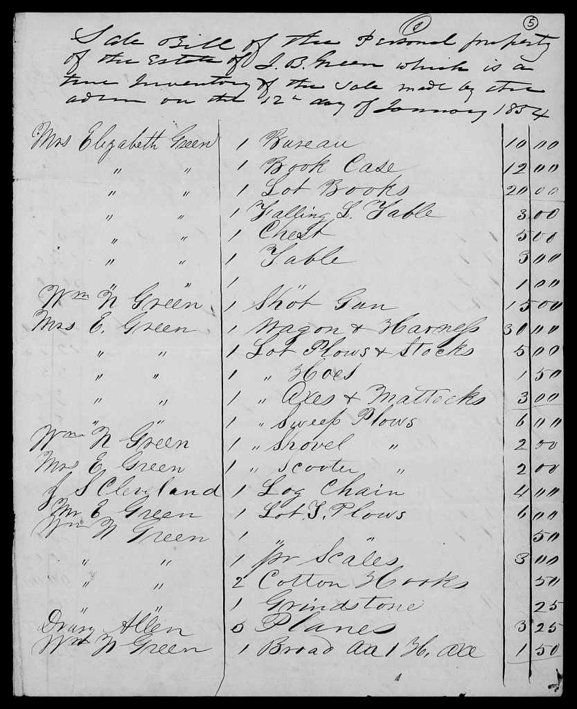 The sale of Joscelin’s personal property was held 12 January 1854 and returned to court by William N. Green on 20 February 1854.[40] It shows Joscelin’s widow Elizabeth and son William as the primary buyers, with Elizabeth buying most of the household goods, and William and Elizabeth together buying most of the farm equipment and livestock. Joscelin’s unmarried daughter Frances Jane Green bought a bay horse that was, I’d think, likely her riding horse. Also buying at the estate sale was Drury Allen, brother-in-law of Elizabeth Nichols Green, the husband of Elizabeth’s sister Susan. The personal estate sold for $1,076.67½.
