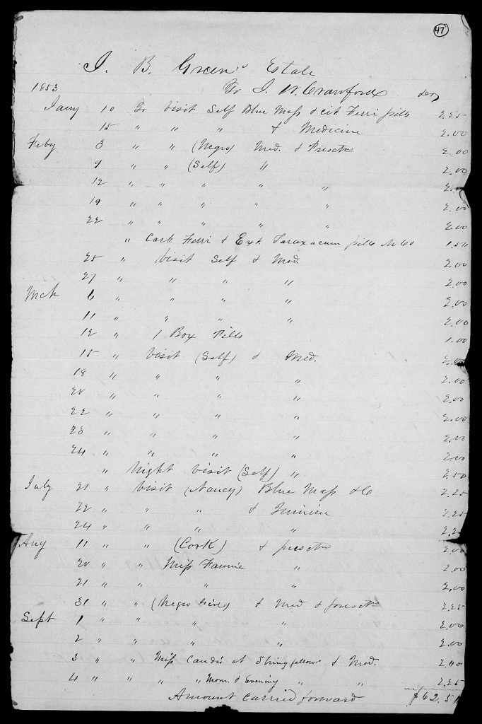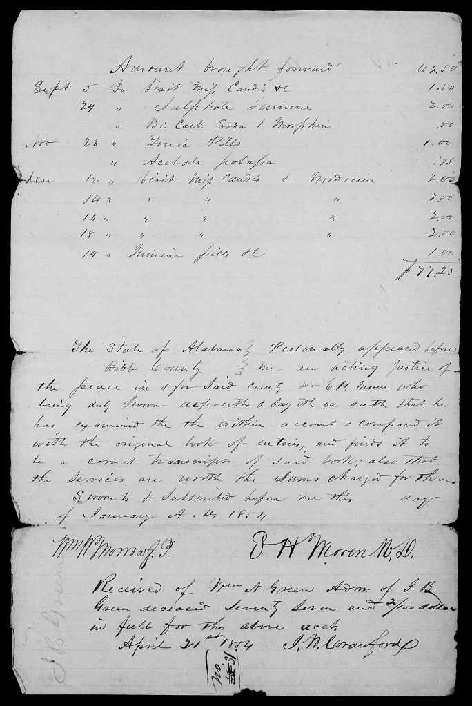 Joscelin B. Green died in 1853 in Bibb County. A number of items in the extensive loose-papers estate file held for him in Bibb County suggest that he died between 25-28 March 1853. In the estate file there is an account of Dr. J.W. (James Wilson) Crawford (1822-1883) for his visits to the Green household beginning in January 1853. The account shows him coming to the family a number of times in March 1853 to provide care for Joscelin. His last visit to Joscelin was on 24 March, when the account says that Dr. Crawford went to the house both in the day and at night, which suggests that Joscelin was close to death on the 24th. From that point forward, Dr. Crawford’s account says that he continued treating family members and enslaved persons belonging to the family, but Joscelin himself is no longer mentioned.