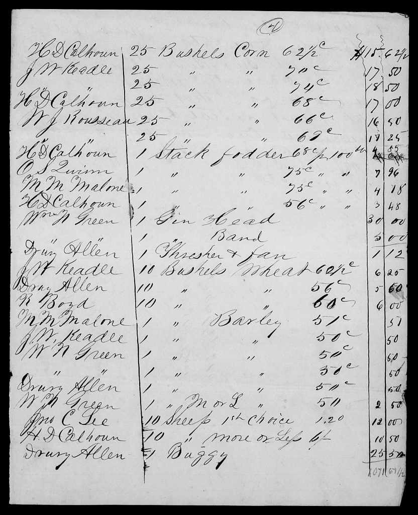 In addition to these accounts, there’s an 1851-2 account with blacksmith J.C. Campbell; an 1852 store account for goods purchased from Charles Sanford, submitted 6 May 1853; an 1852-3 store account with J.S. Kennedy for items including tobacco, sugar, salt, crackers, and fish; an 1852-3 account with J.J. Tucker for brandy, wine, mackerel, crackers, raisins, etc.; an 1851-2 account with Sanders and Potts for leather goods and leather work such as shoes and boots; an 1852 account of W.L. McMath for visits to prescribe medicine to Candace; an 1852 account with a merchant whose name is difficult to read — it’s something like Tusk Manfy and Co. — for cloth, patterns, a bonnet for Mrs. Stringfellow (Joscelin’s daughter Susan), coffee and so on; an 1852 account with Bernhard and Campbell for items including cards of pins, linen, calico, a fan, a box of soda, envelopes and paper, a pair of balances, ribbon, buttons, a bonnet, brass tacks, silk, brandy, plates, a bowl, gilt paper, ladies shoes, a walking cane, and a pitcher; and an 1851 account with A.K. Calhoun & Bros. for lumber.