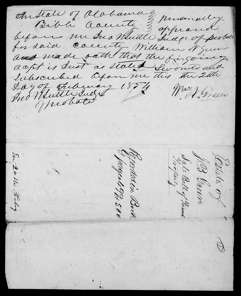 3 September 1841, Joscelin B. Green of Tuscaloosa County mortgaged his land in Bibb County to Anthony Stoutenborough of Dallas County to secure a debt of $3,240.[24] Joscelin signed the mortgage with B.L. Defreese and C.H. Collier witnessing. On 4 September Joscelin affirmed the mortgage and it was recorded 13 October. A marginal note by A. Stoutenborough dated 14 April 1854 says that the debt was satisfied in full. The receipt for this payment from Joscelin’s estate is in his loose-papers estate file, which I’ll discuss later.