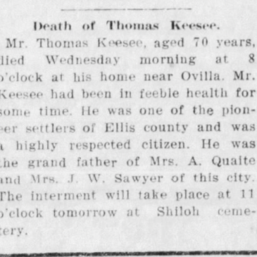 Or, Subtitled: “There is doubtless in store for him a great reputation as the pioneer and principal breeder of fine-stock in the State” This posting is a continuation of a previous posting in which I discussed the first seven children of Thomas Keesee and Jane Caroline Green. In what follows, I’ll provide information about Thomas … More Children of Jane Caroline Green (1808-1897) and Husband Thomas Keesee: Louisa, Eleanor, William Fortenberry, John Hill, Patience W., and George Sidney Keesee
