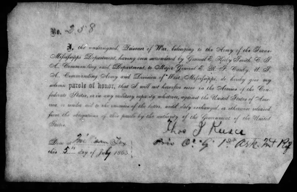 More biographical information about Thomas is included in his Civil War service records and in an application he made for a pension for his Civil War service. The service packet shows him enlisting at Little Rock on 12 May 1862 in Co. G (Captain Norris’ Company) of 1st Arkansas Mounted Rifles (CSA).[14] He entered service as a private and was then made a sergeant at an unspecified date. Thomas’ pension application filed on 7 June 1907 in Ellis County, Texas, states that Thomas served in this cavalry unit from the fall of 1861 to the end of the war.[15] The pension file has an affidavit by Thomas’ brothers George Sidney Keesee and John Hill Keesee filed in Ellis County on 17 July 1907 in which they verify Thomas’ service and state that he enlisted in Co. G of 1st Arkansas Mounted Rifles, but these affidavits give the enlistment date as February 1862 and the place of enlistment as Hillsboro in Union County, Arkansas. Thomas’ brother Milton served in the same unit during the war.[16]