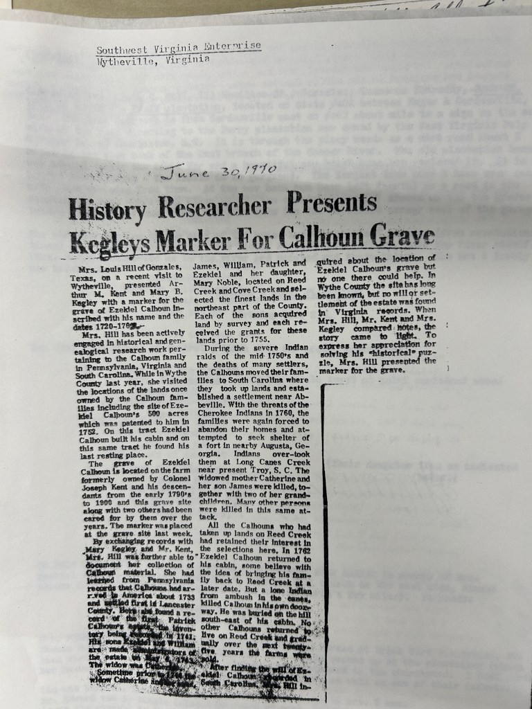 Here’s another document I’ve now added to a previous posting following my recent research trip to Clemson University Library’s Special Collections and Archives. I added the following information to a previous posting about Ezekiel Calhoun (abt. 1720 – 1762), along with a digital image of the newspaper article at the head of this posting: