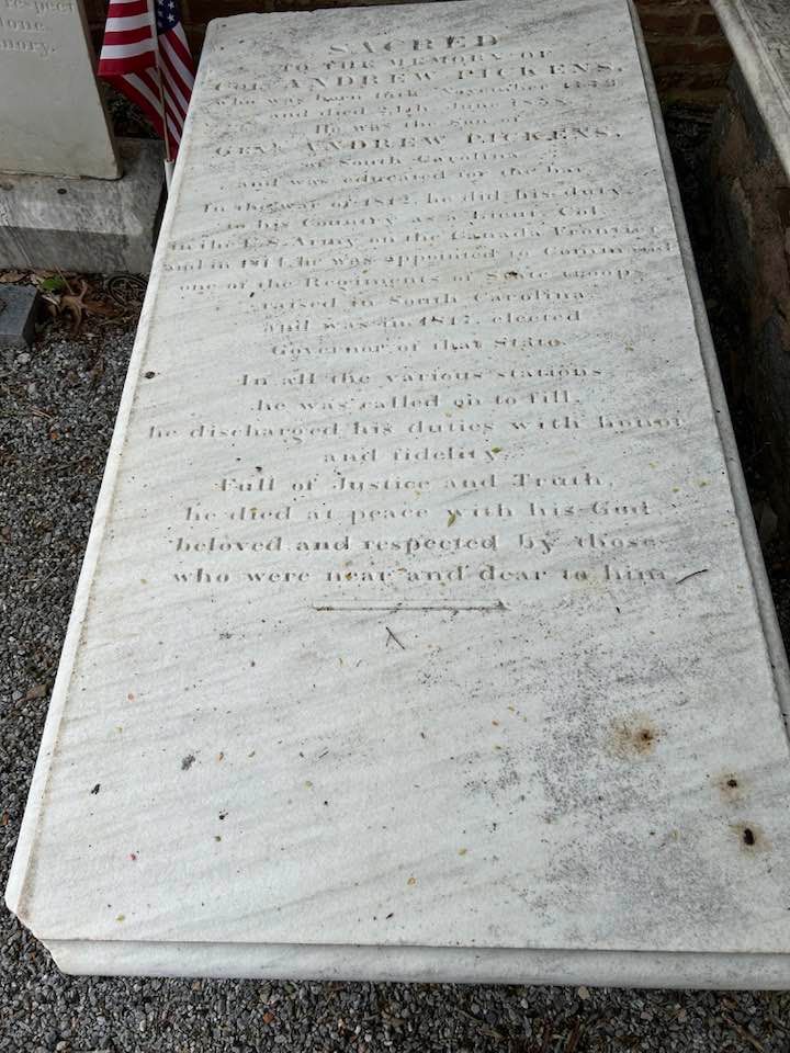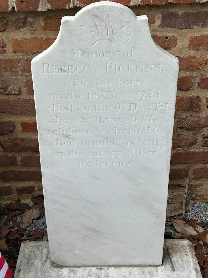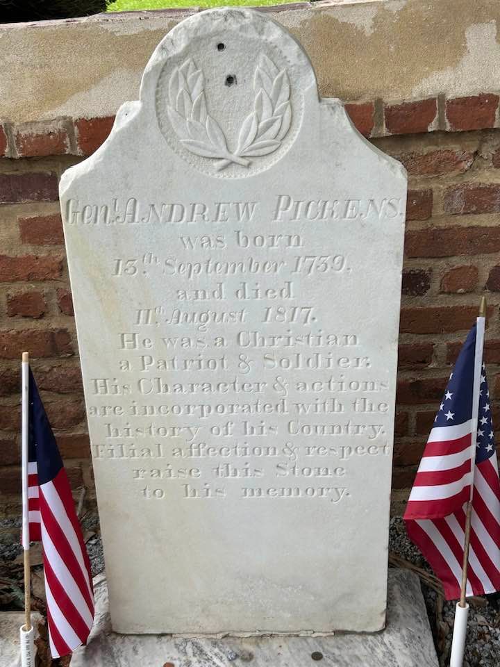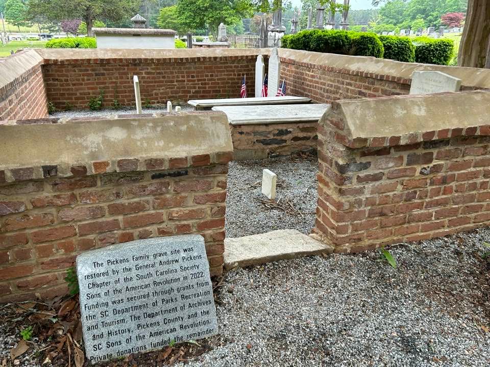 The cemetery of Old Stone Church, in which Andrew and Rebecca Calhoun Pickens and many members of their family are buried, as well as other local luminaries including Robert Anderson, is right across from the church. Andrew and Rebecca are buried in a brick-enclosed plot with other family members. In 2002, the General Andrew Pickens Chapter of the South Carolina Society Sons of the American Revolution restored the Pickens plot, its surrounding wall, and the graves in it. A marker outside the plot notes the various funders of this project.