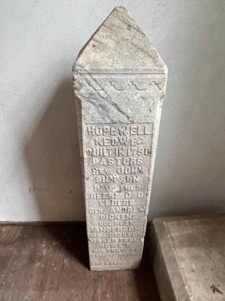 Then in October 1789, Andrew Pickens, his friend and neighbor Robert Anderson and others petitioned the Presbyterian Synod for supplies for Richmond and Hopewell churches, the latter named for Andrew Pickens’ former church in the Long Cane settlement, and the Hopewell Presbyterian Society was established in Pendleton District. In 1790, a log church was built for Hopewell church near the house of Andrew and Rebecca’s son Ezekiel Pickens. When that church burned in 1796, a new church was built of stone, with construction beginning in 1797 under the supervision of Irish stonemason John Rush, who did much of the stonework. This church, which was completed in 1800, became known as the Old Stone Church.