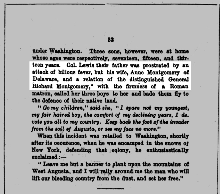In his Biographical Sketch of Anne Montgomery Peyton, John Lewis Peyton states that William Lewis’ wife Anne Montgomery was “of Delaware, and a relation of the distinguished General Richard Montgomery.”[20] As with his History of Augusta County, in this biography of William Lewis and Anne Montgomery’s daughter Anne Montgomery Peyton, John Lewis Peyton does not provide a name for Anne Montgomery’s father.