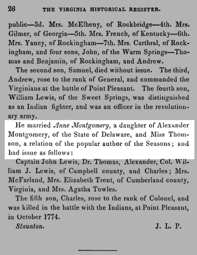 He [i.e., William Lewis] married Anne Montgomery, a daughter of Alexander Montgomery, of the State of Delaware, and Miss Thomson, a relation of the popular author of the Seasons….
