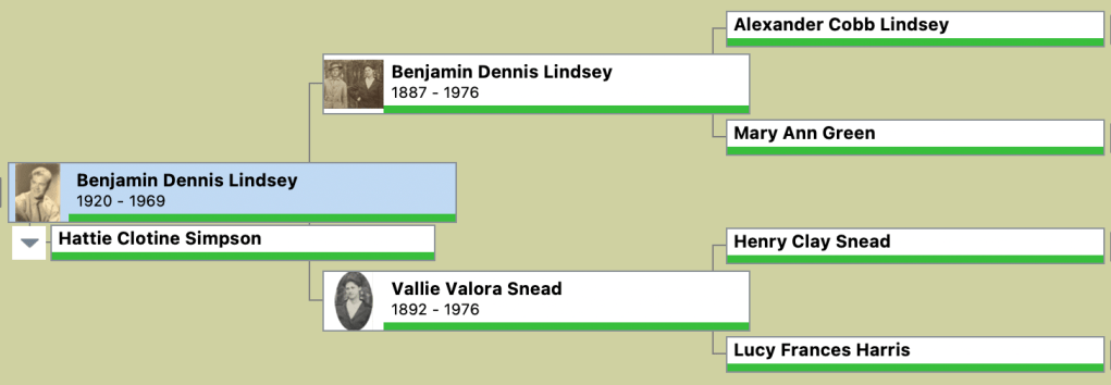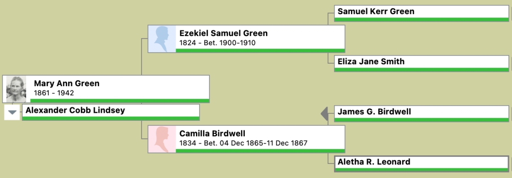 I’ve spent lo these many months now on this blog documenting the ancestry of my paternal great-grandmother Mary Ann Green Lindsey (and here). I followed Mollie Green Lindsey’s Green line back from her father Ezekiel Samuel Green (that series began here) to his father Samuel Kerr Green (starting here) to Samuel’s father John Green (beginning here) and John’s likely father Benjamin Green. See the charts above.