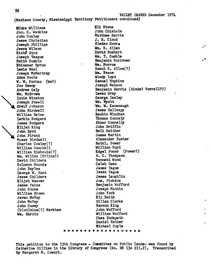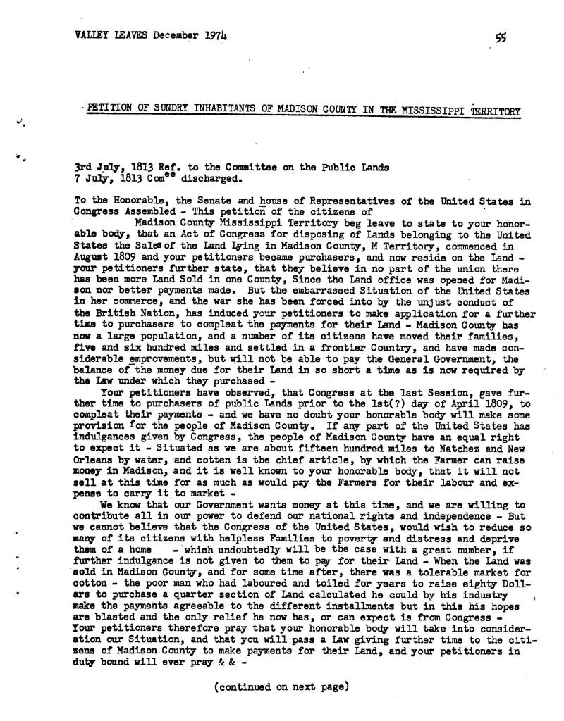 [10] “Petition of Sundry Inhabitants of Madison County in the Mississippi Territory,” 3 July 1813, transcribed in Valley Leaves 9,2 (December 1974), pp. 55-6; and see U.S. House of Representatives, Journal of the House of Representatives of the United States, James Madison Administration 1809-1817, vol. 7: Thirteenth Congress, First Session, May-August 1813 (Washington, D.C.: U.S. Government Printing Office, 1813), p. 135.
