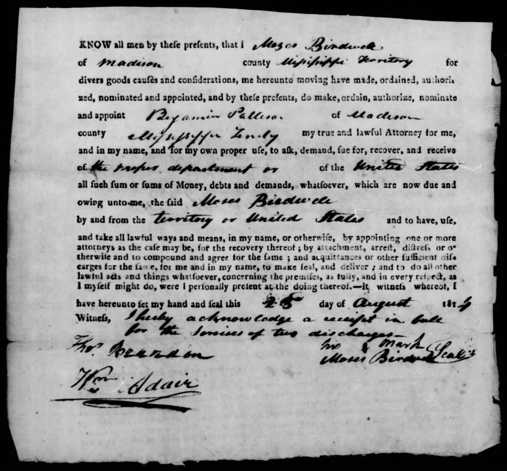 In 1813, Moses Birdwell gave War of 1812 service guarding the frontier in Madison County in Lieutenant Colonel Charles Burrus’ 16th Regiment of the Mississippi Militia.[11] Moses’ service packet shows him as a private on the muster roll of a company initially headed by Captain Samuel Allen and then by Captain Stephen Griffiths, from 8-17 October 1813. He was on the company’s payroll from 2 November – 2 December 1813, with pay of $6.36 allotted to him. In the service papers is a 25 August 1814 power of attorney from Moses to appointed Benjamin Pattison appointing Pattison to receive any money due Moses for his service, signed by mark with witnesses Thomas Beardon and William Adair. In all documents I’ve found prior to and after this, Moses always signed his name, so the signing by mark here is unusual.