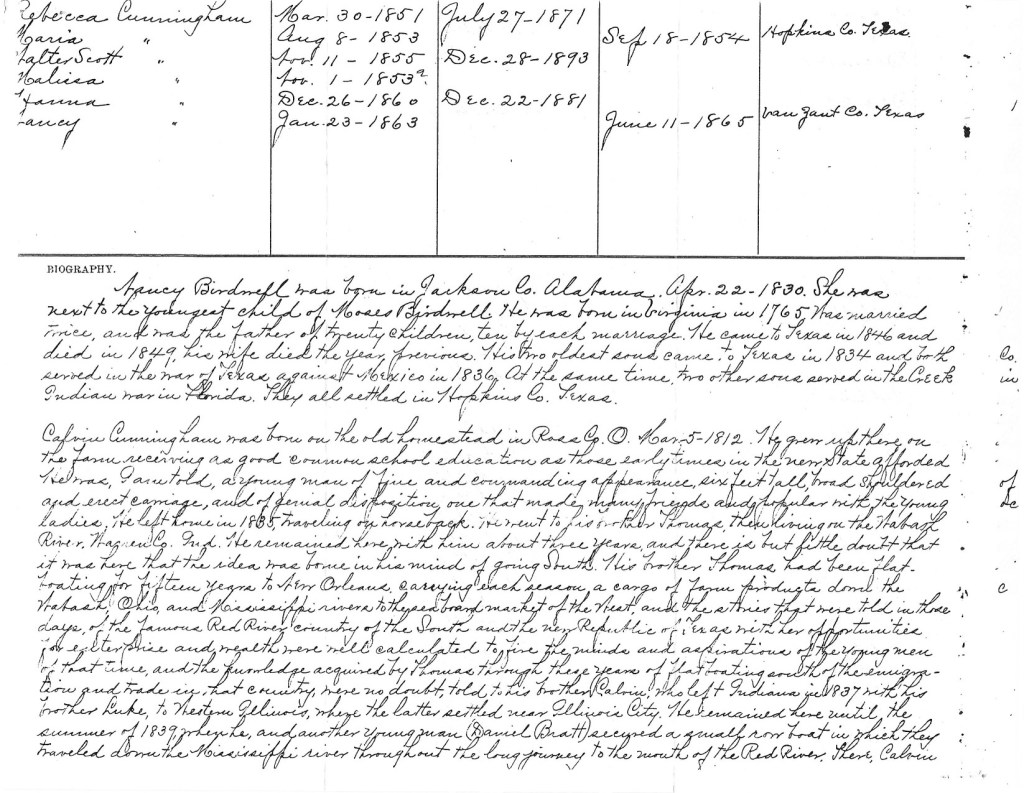 The scant information we have about Moses’ final years in Texas and his death there in 1849 comes from a handwritten journal composed by members of the Cunningham family into which Moses’ daughter Nancy married. In September 1996 and October 1997, a Cunningham descendant, James Bryant, wrote me to provide information about the Cunningham journal. He says that the portion of the journal stating that Moses Birdwell died in Texas in 1849 after having moved there in 1846 was composed by Walter Dunn Cunningham (1883-1913), his sister Caroline, and their father Scott Cunningham prior to 1903. Walter and Caroline were children of Scott Cunningham (1855-1923), whose father David Cunningham (1809-1877) was a brother of Calvin Cunningham (1812-1865), husband of Moses’ Birdwell’s daughter Nancy. According to James Bryant, in 1997, the Cunningham journal belonged to a grandson of Scott Cunningham, David Cunningham, who lived in Missouri.