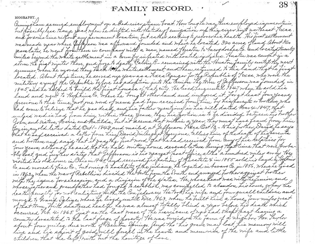They continued up the Red River to the north of Clarksville, Texas. They went a short distance by land to south of where Paris, Texas is today. They lived for a short time with Ritha’s brother in Hopkins Co., Texas, then moved to and lived about 14 miles south of Paris, Texas on Click Creek.