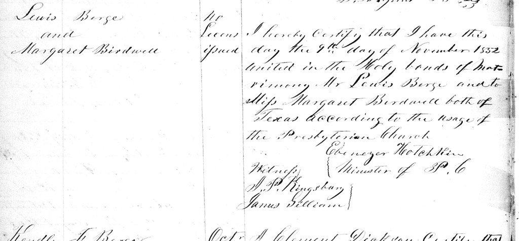 As a previous posting indicates, the 1850 federal census shows Samuel, aged 26, a farmer born in Alabama, living in Hopkins County, Texas, in the household of Boney and Margaret Woods with a Rebecca and Margaret Birdwell who are evidently his sisters.[5] As the linked posting also notes, living next to the Woods household is Henry Landers Birdwell with his wife Cynthia, and next to Henry is the household of Nancy Birdwell Cunningham and husband Calvin Cunningham, with Nancy’s half-brother Abraham Marshall Birdwell in the household. Next to the Cunningham family is the family of Ritha Birdwell and husband George Madison Connally, Ritha being a sister of Marshall and a half-sister of the other Birdwell siblings living side by side on this census.