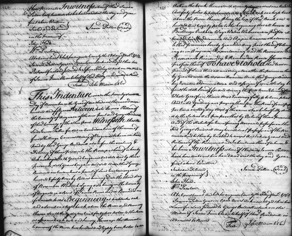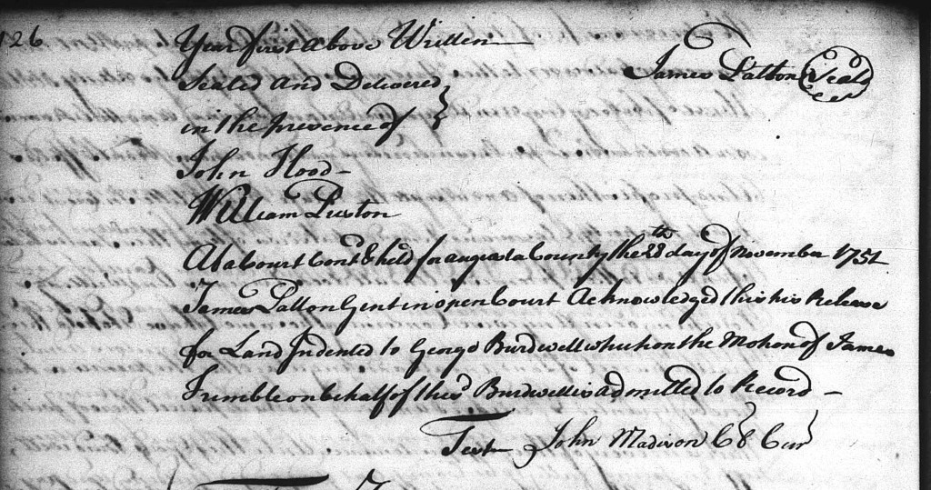 On 28 November 1751, George Birdwell bought 140 acres on the James River in Augusta (later Botetourt) County, Virginia, from James Patton.[22] The deed spells George’s surname Burdwell, and states that the land had been patented to Patton on 3 November 1750 and was in a “bent” of the James River. George paid £7 for the tract. The land description gives names of no neighbors and is a metes-and-bounds description of the land. James Patton signed the deed with John Flood and William Paxton as witnesses.