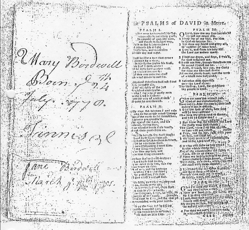 As I’ve noted above, in a previous posting I discussed a family bible published in Edinburgh in 1767 that appears to have belonged to George Birdwell’s son John (1770-1854). As I stated above, the register of this bible records the names and birthdates of George’s children by his last wife Mary. The posting I’ve just linked provides digital images of two pages from the bible, the publication page and the page of names and birthdates of George Birdwell’s first five children by wife Mary, George, Elizabeth, Benjamin, Joseph, and Moses.