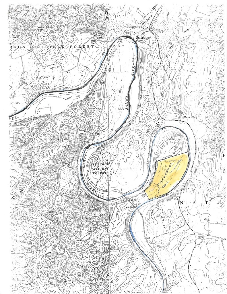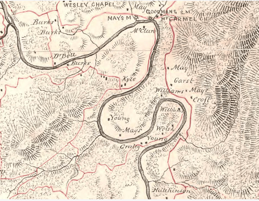 A contemporary USGS map included in the report of the Fourth Annual Birdwells Across America Reunion in 1997 identifies the land on which George Birdwell lived as “Horseshoe” and shows it adjacent to Jefferson National Forest, which borders Horseshoe on the west. A map produced by the Confederate Engineer’s Office of Virginia in 1864 and held by Virginia Historical Society indicates that in 1864, landowners named Young and Mays either owned or lived on the horseshoe bend tract.[33] John May was a county surveyor in the 1770s and today a cemetery just northeast of the horseshoe bend tract, Mays cemetery, is named either for him or his descendants.