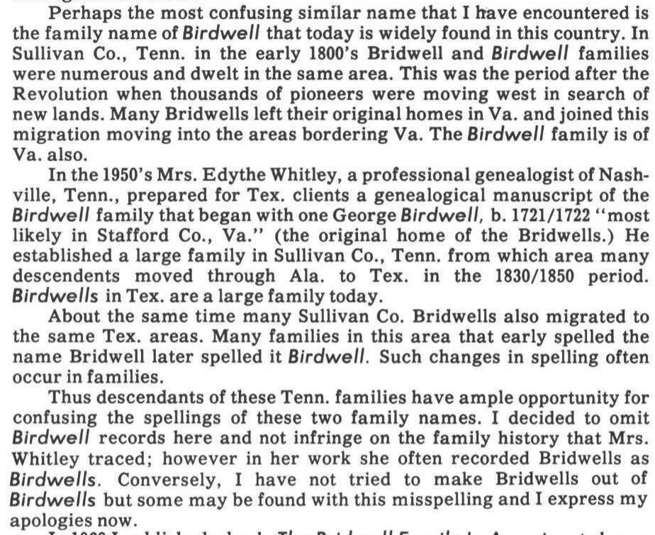 [2] Erbon W. Wise, The Bridwell Family in America (Alexandria, Louisiana: Louisiana Offset Printers, 1968; rev. 1978), p. 4. Jerry Birdwell’s chart (see n. 1) states that he was citing as a source a handwritten, unpublished manuscript compiled by Edythe Rucker Whitley for Texas descendants of George Birdwell, which he thought was compiled about 1940. In letters he sent me on 6 November 1988, 1 February 1989, and 3 October 1989 Erbon Wise (who then lived in Sulphur, Louisiana), told me that the Whitley manuscript was composed about 1951, and that he had a typescript copy sent to him by a member of a Texas Birdwell family about 1977, which he had placed (in part, at least) in a folder labeled something like “Texas Birdwells” in his “Wise” filing cabinet in the Louisiana State Archives genealogical library in Baton Rouge. In 1989, Erbon Wise visited me and showed me this manuscript, indicating that it was apparently also in the archival holdings of Southern Methodist University’s library in a collection of Birdwell papers. I wrote the DeGolyer library at Southern Methodist University after that visit to ask for further information and got no reply.