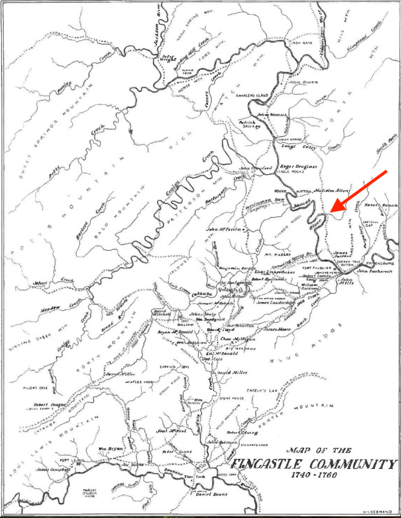 I’ve discussed James Patton in previous postings, noting that Patton was Benjamin Borden’s chief land agent in locating settlers on his Borden tract in Augusta County,[29] and that many of the tracts Patton sold to early Augusta County settlers were actually being lived on by those settlers before they acquired title to their land. I think it’s very likely that George Birdwell and his family were living on the land in the bend of the James River that he bought from Patton in November 1751 prior to Patton’s sale of that land to them.
