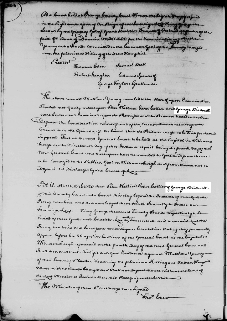 As stated above, the first record researchers have (to my knowledge) found of George Birdwell is an 8 April 1745 court record in Orange County, Virginia.[14] Orange court minutes for that date say that George Birdwell along with Peter Wallace/Wallice and John Collier were sworn and examined in court regarding Matthew Young’s charges for the felonious killing of Andrew Hemphill. The county court then decided to refer the case to the general court at Williamsburg for its next session on 19 April. The three witnesses then gave bond in the amount of £20 each to assure their appearance at the Williamsburg court, to give testimony in the trial.