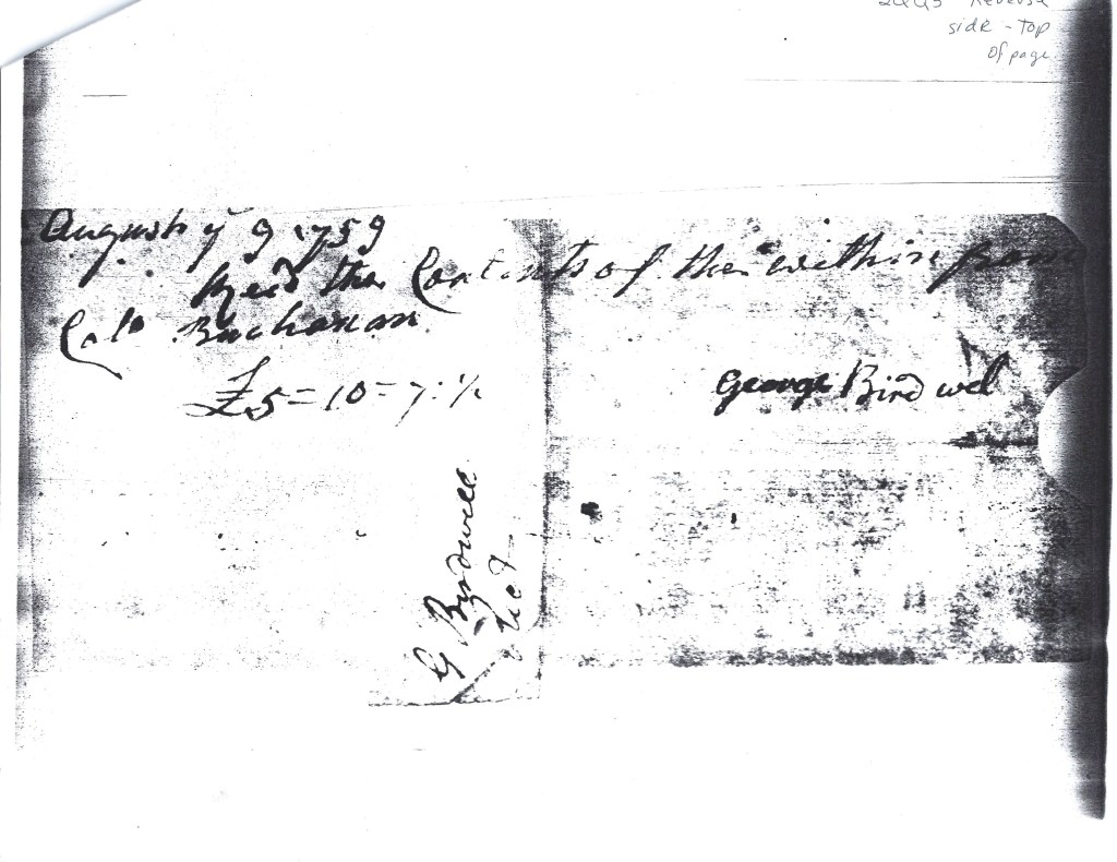 As a previous posting notes, in September 1758, George Birdwell furnished 885 pounds of beef to the troops at Fort Fauquier, and on 5 September 1758, John Buchanan paid him £5 10s 7½d for the beef, with George signing receipt for this payment at Fort Fauquier on 9 August 1759.[4] The posting I’ve just linked has a digital copy of this receipt, showing George signing as George Birdwel.