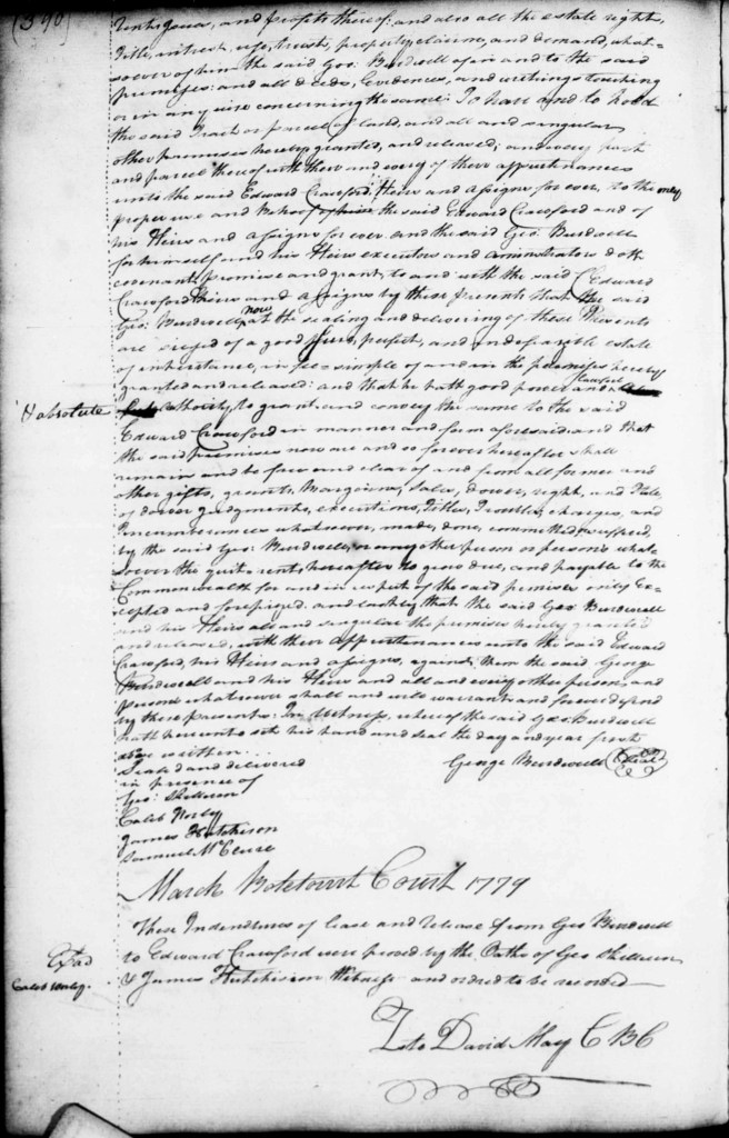 On 1-2 March 1779, George Birdwell sold his 140 acres in a bend of the James River in Botetourt County to Edward Crawford.[40] The deed states that the land sold for 500 pounds, but the word “pounds” is marked out and followed by “Current money of Virginia.” George signed the deed, with the deed book record spelling the surname as Burdwell. The deed was witnessed by George Skillern, Caleb Worley, James Hutchison, and Samuel McClure. Skillern and Hutchison proved the deed at March court in Botetourt and it was recorded.