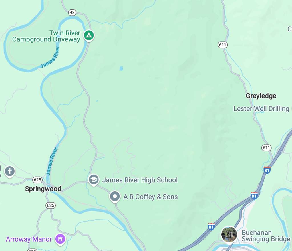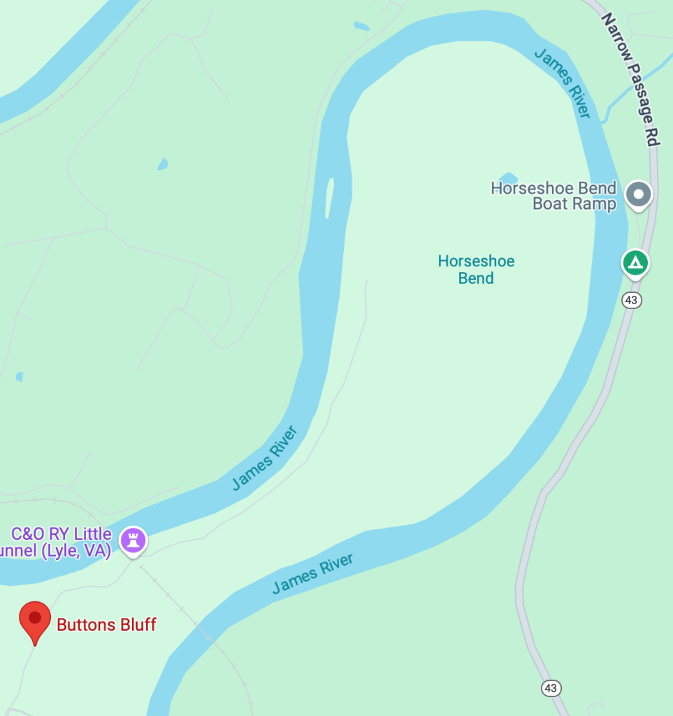 A report issued by the Fourth Annual Birdwells Across America Reunion held in Roanoke, Virginia, in July 1997 states that Edward Crawford sold George Birdwell’s 140 acres in the bend of the James in Botetourt County in 1800 to Robert Ritchy, and in 1997, the land was owned by a Finch family of Roanoke. This report indicates that when Reverend Crawford sold the land in 1800, another survey was done, which is in Botetourt County’s 1833-1842 Survey Record Bk., p. 30. A local road called Buttons Bluff Road located north of the community of Springwood runs into the Horseshoe Bend property owned by George Birdwell from 1751-1779, and in 1997, a Seibel family was living on the property, according to the Birdwell reunion report.