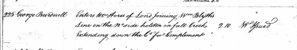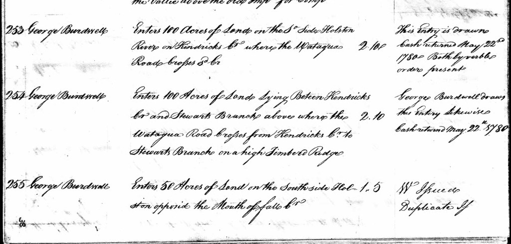 On 22 February 1780, George Burdwell entered one hundred acres of land in Sullivan County, North Carolina, joining William Blythe’s line on the north side of the Holston River at Fall Creek, and received a warrant for the land.[48] On 3 March 1780, George Burdwell entered three more tracts in Sullivan County, all on the south side of the Holston – two tracts of 100 acres each, one on Kendricks Creek where the Watauga road crossed the creek, the other between Kendricks Creek and Stewart Creek above where the Watauga road crossed Kendricks Creek; and 50 acres on the Holston opposite the mouth of Fall Creek. The Kendricks Creek referenced here is Kendrick Creek.