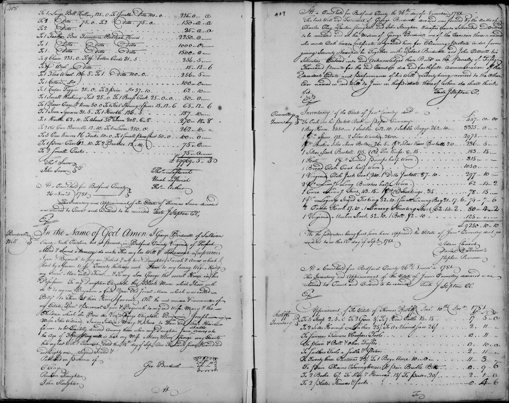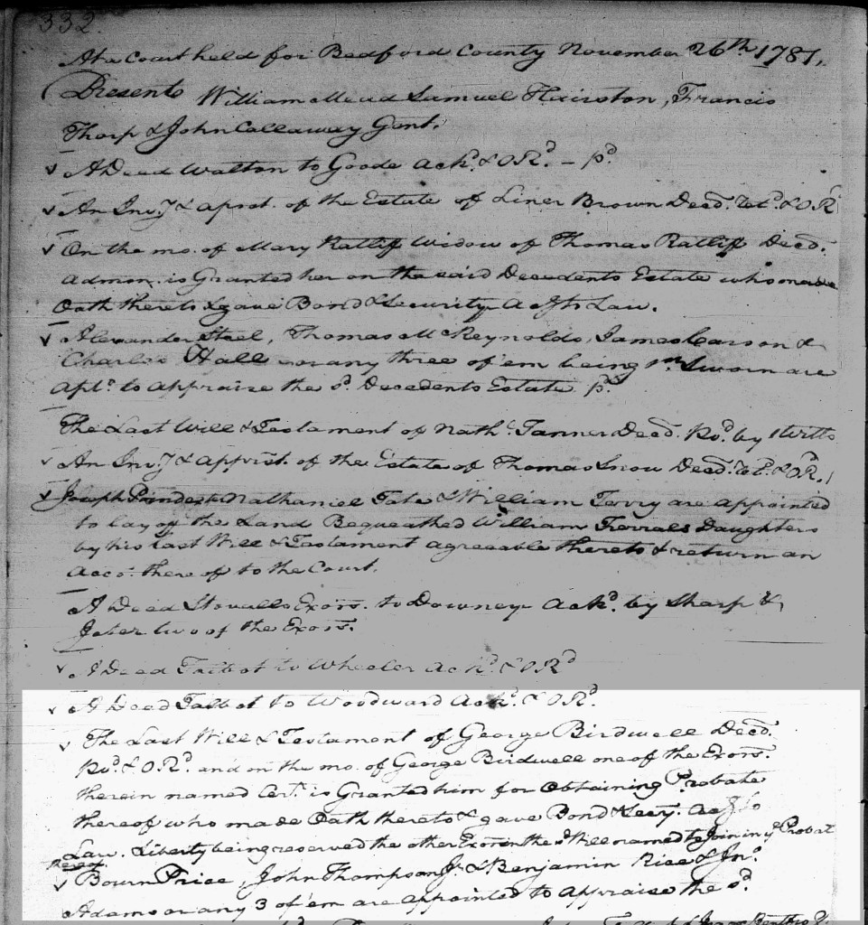 The will was probated at Bedford County court on 26 November 1781, with Charles Clay and Reuben and John Slaughter giving oath. At the motion of George Birdwell Jr. as one of the executors, it was then recorded and George was given probate after he had made bond of £50,000 with Robert Birdwell and John Cottrell as securities. The court record, which is appended to the will itself in Bedford’s Will Book 1, states that liberty was reserved to the other executor (i.e., Mary) to join in the probate when she might think fit. Court minutes for the probate action state that Bourn Price, John Thompson Jr., Benjamin Rice, and John Adams or any three of them were appointed to appraise the estate.[53]