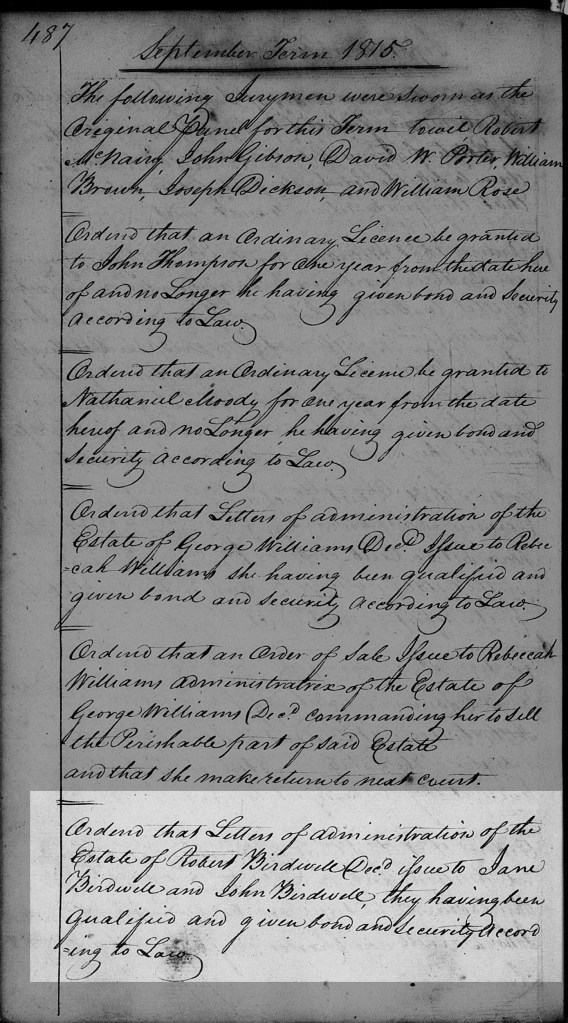 Since records pertaining to Robert Birdwell’s estate when he died in Giles County, Tennessee, in 1815 indicate that he had a wife Jane, I’m inclined to think that at least from June 1791 up to his death in 1815, he was married to Jane Robinson. Whether he had any wife prior to Jane, I can’t say. Jane Robinson is the only documented wife of Robert Birdwell I’ve found.